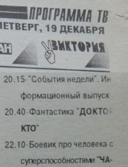 The earliest listing found was on Thursday, 19 December 1996 at 8.40pm on a channel named Виктория (which translates as "Victoria"; this appears to be one of the channels operated by Moscow-based broadcaster CTC, which launched only a few weeks earlier, on 1 December).